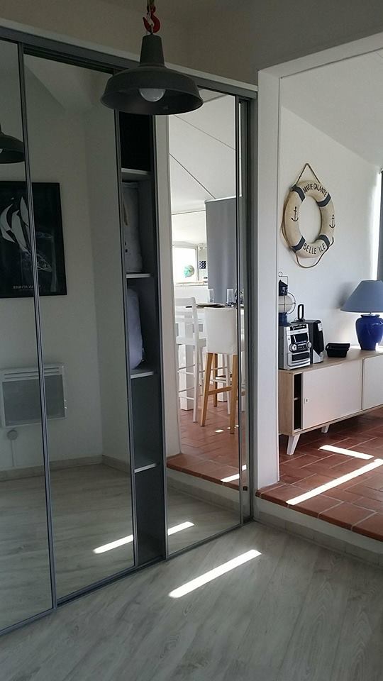 A gauche de l’entrée, vous trouverez une très grande armoire à miroirs avec penderie et étagères.