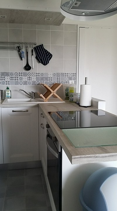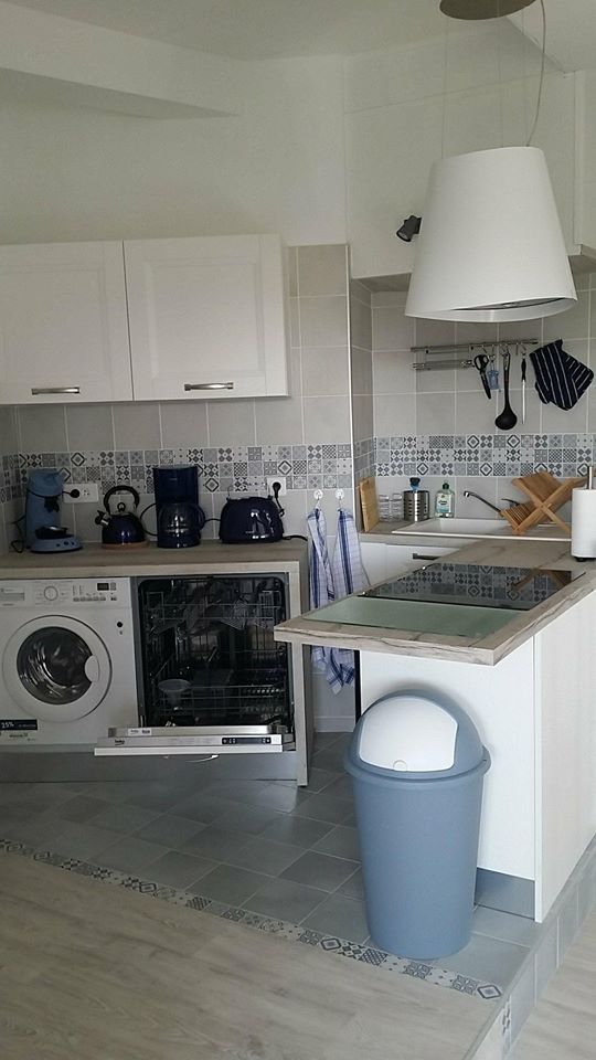 Sur la droite de l’entrée, la cuisine ouverte : celle-ci est entièrement équipée à neuf : micro-ondes, lave-vaisselle, hotte, four, plaque à induction 4 feux, lave et sèche-linge et bien entendu couverts, ustensiles, vaisselle, verres … cafetière classique, Senseo, bouilloire, grille-pain … tout pour votre confort.